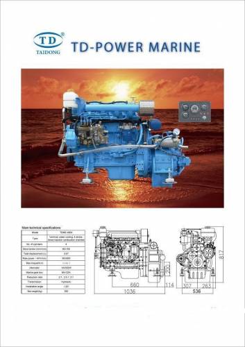 Морской стационарный судовой четырехтактный дизельный двигатель с двухконтурной системой охлаждения (мокрый выхлоп) TDME-490, 58 л.с., 3000 об/м. В комплект поставки входит приборная панель с кабелем (4 м), воздушный фильтр, амортизационные подушки. Двигатель снабжен мокрым выхлопом. Реверс-редуктор механический (1,88:1; 2,74:1) или гидравлический (2:1; 2,5:1; 3:1).